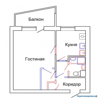 1. Значительно увеличилась площадь ванной комнаты, за счет части коридора. 2. Увеличилась площадь прихожей, за счет части гостиной. 3. Возможность прохода непосредственно из кухни в гостиную.