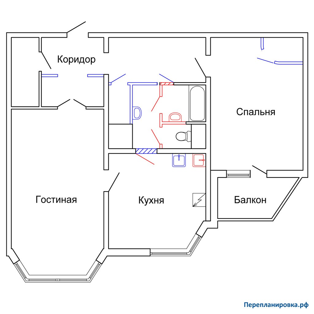 1. Демонтаж перегородок между ванной, туалетом и коридором, с переносом сантехники и гидроизоляцией пола. 2. Закладка дверного проема между кухней и коридором. 3. Установка перегородок между ванной комнатной и холлом. 4. Установка перегородок в коридоре. 5. Оборудование гардеробной в спальне.